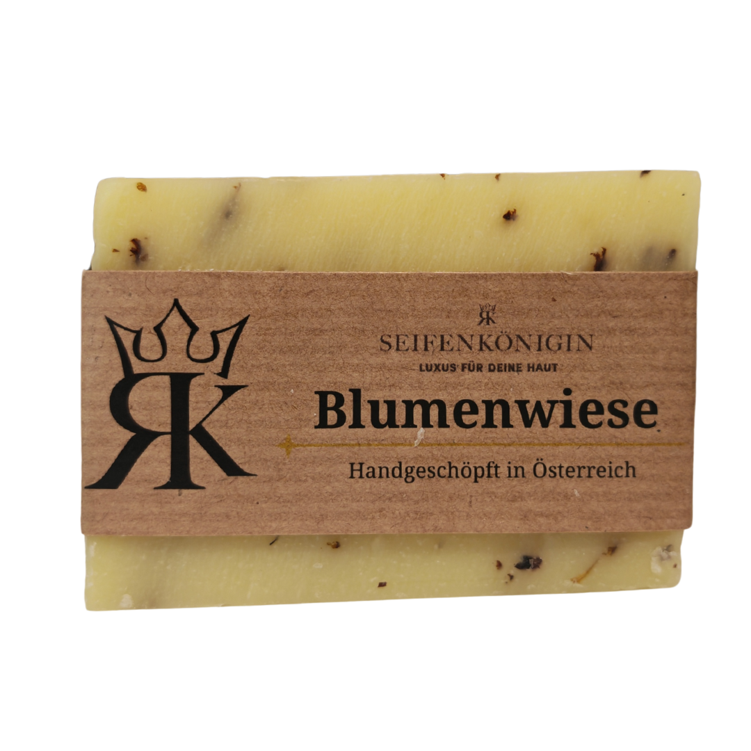 Die Blumenwieseseife wird traditionell in Österreich von Hand gefertigt und vereint hochwertige Pflanzenöle in Lebensmittelqualität mit echten Blüten.